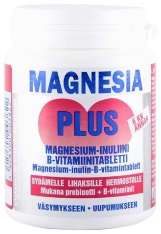Magnesium-Inuliini-B-vitamiinitabletit. Ravintolisä. Annostus 1 tabletti päivässä. Ilmoitettua suositeltua vuorokausiannosta ei saa ylittää. Ravintolisä ei korvaa monipuolista ruokavaliota eikä terveitä elämäntapoja. Tuote on säilytettävä pienten lasten ulottumattomissa.