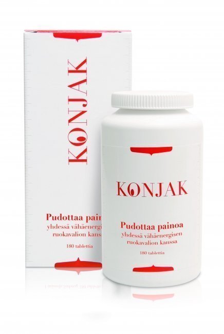 KonjakKun olet päättänyt muuttaa ruokailutapasi terveellisemmäksi. . . KONJAK AUTTAA IHAN OIKEASTI LAIHTUMAANKonjak on painonhallintatuote, josta on tutkittua, turvallista ja tehokasta apua laihduttamiseen. Konjak tehostaa huomattavasti vähäenergisellä ruokavaliolla laihduttamista, kuin laihdutettaessa pelkällä kevennetyllä ruokavaliolla. Konjak on Suomen markkinoilla ainoa ravintolisä, joka sisältää EU:n vahvistaman terveysväitteen mukaisen määrän (3 g/vrk) laihduttavaa glucomannankuitua sekä aimo annoksen verensokeria tasapainottavaa ja makeanhimoa hillitsevää kromia (120 mcg/vrk). Konjakin molemmilla laihtumista tehostavilla ainesosilla on vahvat perustelut. Terveysväitteen saadaksen ravintoaineen vaikutukset on todistettu laajoilla tieteellisillä tutkimuksilla. Konjak täyttää ja hillitsee nälkääKonjak on valmistettu vesiliukoisesta Amorphophallus konjac-juurimukulan kasvikuidusta. Tämä kaloriton luonnonkuitu sitoo itseensä valtavan paljon vettä. Ennen ruokailua veden kanssa nautitut Konjak-tabletit (2 tabl. /ateria) muodostavat vatsalaukkuun kuituhyytelöä, joka täyttää vatsaa ja tukee normaalia suolentoimintaa. Konjakin avulla laihduttajan on helpompaa pienentää päivittäistä energiansaantiaan ja hallita syömistään kun olo tulee kylläiseksi pienemmillä, kohtuullisen kokoisella ja vähemmän energiaa sisältävillä ruoka-annoksilla. Konjak helpottaa makeanhimoaKonjak tablettien sisältämä kromi helpottaa jo muutamassa päivässä makeanhimoa ja epäterveellisten välipalojen nauttimista aterioiden välillä. Monelle tuttu turha, makea suupala aterian päätteeksi on Konjakin nauttimisen yhteydessä helppoa opetella jättämään kokonaan väliin. Yhdessä verensokeria tasapainottavan kromin kanssa Konjak on erittäin tehokas ravintolisä painonpudotukseen ja ohjaa pysyvään ruokailutapojen muutoksiin. Konjak tukee laihtumista