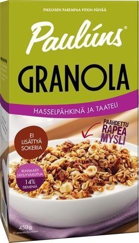 Pauluns Granola Hasselpähkinä & Taateli on sokeroimaton muromysli, jossa rapean täysjyväviljan lisäksi on siemeniä, hasselpähkinää ja taatelia. Sisältää luontaisesti runsaasti kivennäisaineita ja vitamiineja. Lisäaineeton. Katso myös reseptivinkki Paulunsin sivuilta: Rapea granola-broilersalaatti Tutustu myös muihin Pauluns-tuotteisiin.