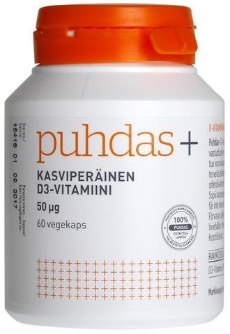 Puhdas+ Kasviperäinen D3-vitamiini 50 mikrog on uuden sukupolven D-vitamiinivalmiste. 100 %:sti kasviperäinen! Ravintolisä. Puhdas+ Caps D-vitamiini -valmiste sisältää 50 mikrogrammaa hyvin imeytyvää D3-vitamiinia (eristetty jäkälästä). Vegekapseli. D-vitamiinia tarvitsemme mm. vastustuskyvyn, luuston ja hampaiden hyvinvointiin. Tuote sopii päivittäiseen käyttöön. Puhdas+ Caps Puhdas+ Caps on sitoutunut tuottamaan 100 % puhtaita ja tutkimukseen pohjautuvia ravintolisiä. Puhdas+ Caps -tuotteet ovat kotimaisia ja korkealaatuisia. Tuotteissa käytetään vegekapseleita ja ne soveltuvat myös kasvissyöjille. Ei piilotettuja täyteaineita Ei säilöntäaineita Ei pintakäsittelyaineita Ei keinotekoisia väriaineita tai makeutusaineita Ei magnesiumstearaattia Annostus Aikuisille 1 kapseli vuorokaudessa. Ilmoitettua suositeltua vuorokausiannosta ei saa ylittää. Ravintolisä ei korvaa monipuolista ruokavaliota eikä terveitä elämäntapoja. Tuote on säilytettävä pienten lasten ulottumattomissa.